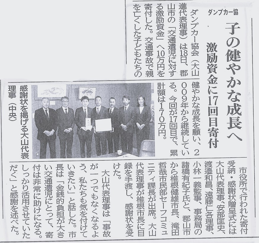 HOME > お知らせ > ダンプカー協会「寄付受納・感謝状贈呈式」 NEWS お知らせ NEWS 2025.12.19 ダンプカー協会「寄付受納・感謝状贈呈式」 令和7年12月に郡山市役所で行われた 寄付受納・感謝状贈呈式にダンプカー協会の理事として、 出席しました。 一覧を見る